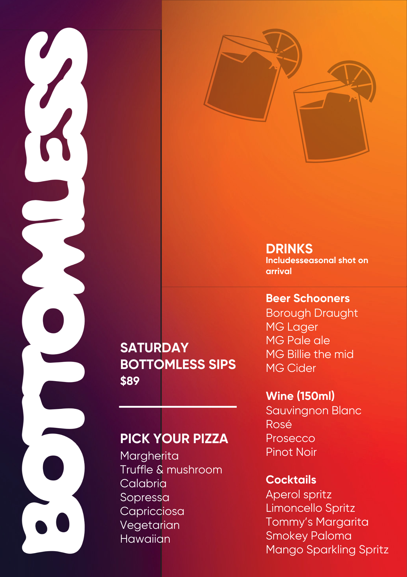 Join us for a delightful experience featuring bottomless drinks, including cocktails, beer, and wine, along with a shot on arrival to kick off the festivities! Enjoy a delicious selection of assorted pizzas, with a variety of flavors to choose from. Our slots are available anytime between 2-4 PM with a 2 sitting time